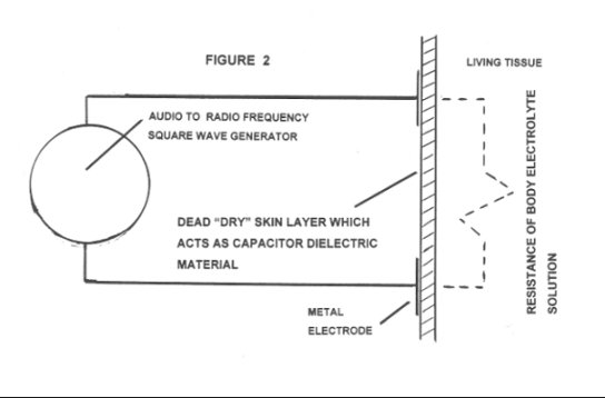 Applying a voltage square wave (see Figure 1) to the bare skin using two electrodes see Figure 2) means one electrode is at a relative positive voltage and the other is at a relative negative voltage and periodically the two electrodes switch polarity back an forth. Several things happen to the tissue, which is exposed to a voltage square wave.