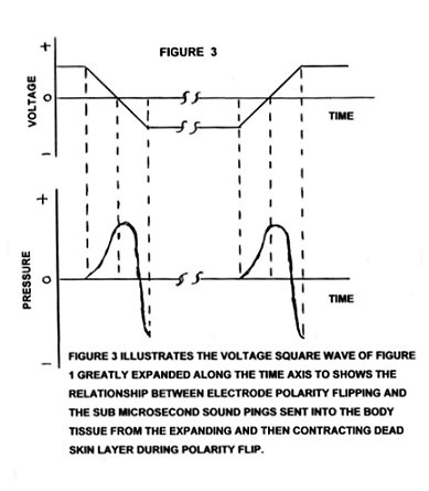 1) During the polarity switch sonic pings of very short time duration (submicrosecond) are generated in the dead skin layer (see Figure 3. These sonic pings have very high frequency ultrasound components associated with them and by adjusting the ping rates (adjusting square wave frequency) a particular ultrasound frequency can be enhanced which will destroy a particular microbe.