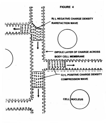 2) During polarity switch the charged salt ions of your body fluid reorganize their positions and concentrations just under the dead skin layer adjacent to the electrode. This reorganization process generates charge density waves of the various ion types present and these charge density waves travel away from the skin surface into the body.(1) A charge density wave is a moving ion concentration excess or depletion of an ion type. These charge density waves are effectively traveling excess net charge and therefore have an electric field which interacts with charged structures such as the dipole charge layers on all of your body cell membranes. As these charge density waves pass through your body they vibrate all of your cell membranes and produce broad band ultrasound which can destroy microbes (see Figure 4).