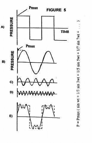 3) The electric current flowing in the tissue from the applied electrode voltage has an electric field associated with it. This electric field places a force on charged particles and charged structures in the tissue. Since this electric field changes its direction periodically (voltage square wave), it generates periodic forces on charged particles and charged structures in the tissues. The detailed calculations are complex, however the end result is that pressure square waves are generated. These pressure square waves have hidden in them a spectrum of periodic mechanical vibration (see Figure 5 ). As can be seen in Figure 5 the frequencies of mechanical vibration generated are odd multiples (1,3,5,7, … ) of the voltage square wave frequency. Figures 5B, C, and D illustrate the first three hidden sine wave components. Figure 5E illustrates these three components added together showing how quickly the hidden components converge to a square wave. So, if one of these frequency components is of strong enough intensity and closely matches the one of the lethal ultrasound frequencies of a particular microbe, it can be destroyed. It should also be pointed out that mechanical vibration which are odd fractional sub harmonics of a fundamental lethal frequency (1/3, 1/5, 1/7, … ) can also kill the microbe if the intensity is high enough.